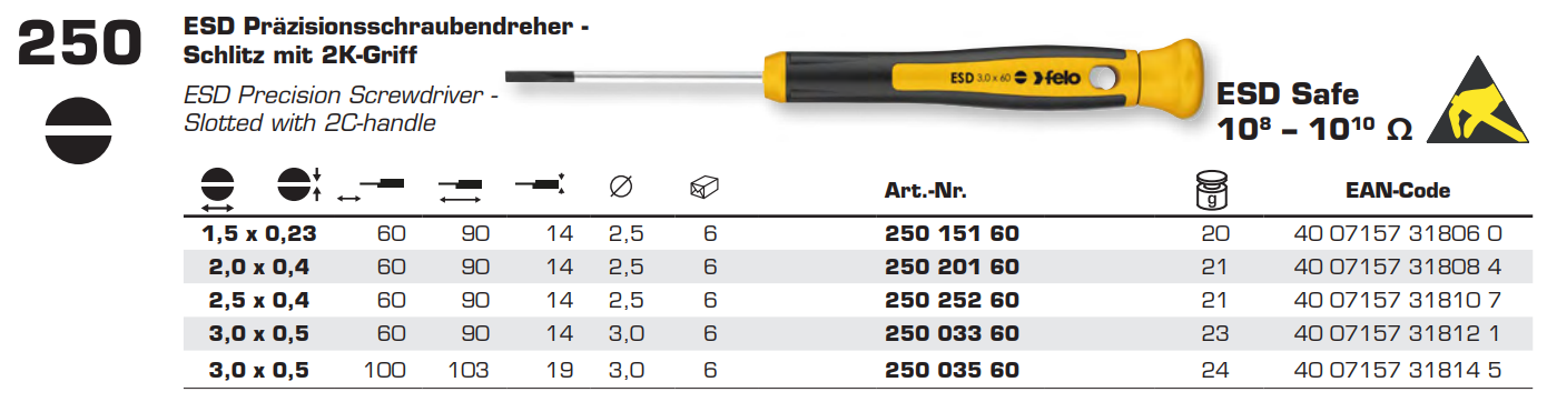 Викрутка для точних робіт шліц 2,5x0,4x60x90 мм FELO ESD Safe (25025260)