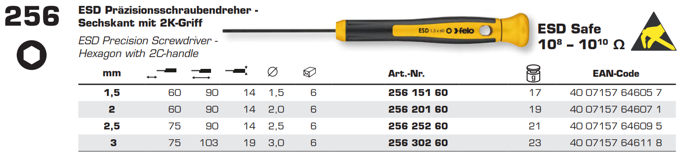 Викрутка для точних робіт спеціалізована HEX 2,0x60x90 мм FELO ESD Safe (25620160)