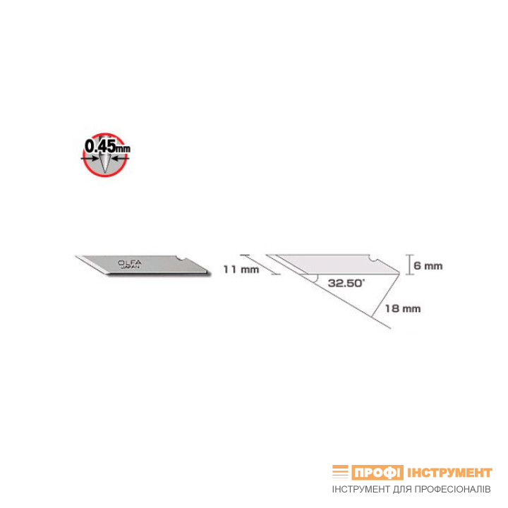 Товщина леза 0,45 мм, довжина ріжучої кромки 11 мм, кут вістря 32,5 o , ширина леза 6 мм.