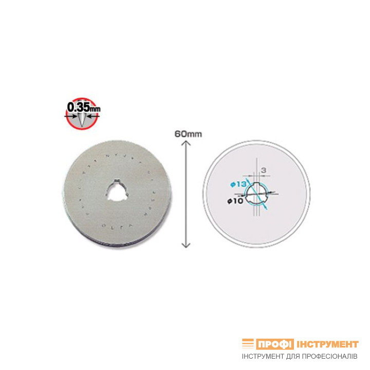 Леза особливо корисні для різання тканини, фольги, гуми, губок тощо на підкладках OLFA по прямих лініях і пологих вигинах. Завдяки використанню інструментальної сталі з відповідно підібраними параметрами та точною заточкою ріжуче лезо є легким, точним і надзвичайно міцним. Товщина леза 0,3 мм, діаметр 60 мм.