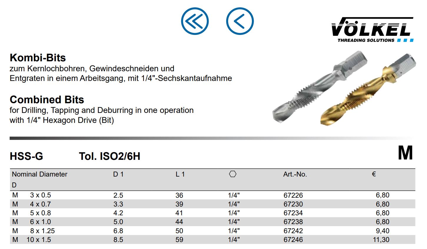 Метчик VOLKEL комбинированный М10х1,5; HSS-G; допуск ISO2/6H; L=59 мм; хвостовик HEX 1/4" (67246)