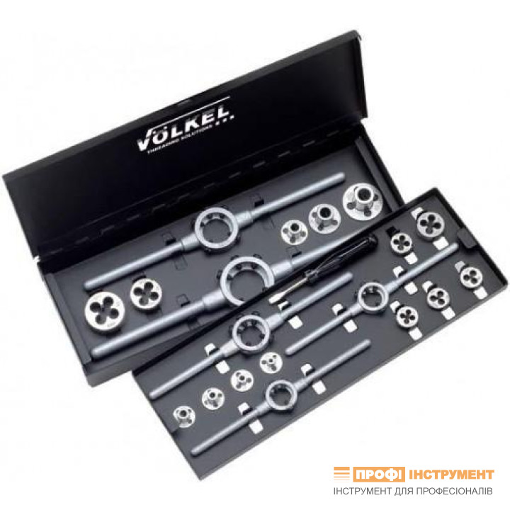 Набор плашек VOLKEL M3-4-5-6-8-10-12, DIN 223 (DIN EN 22568), резьба DIN 13, с комплектом направляющих для плашек 7 шт, Плашкодержатель VOLKELи 20x5, 20x7, 25х9,3 225 (DIN EN 22568), HSS-G, металлический кейс (49599)