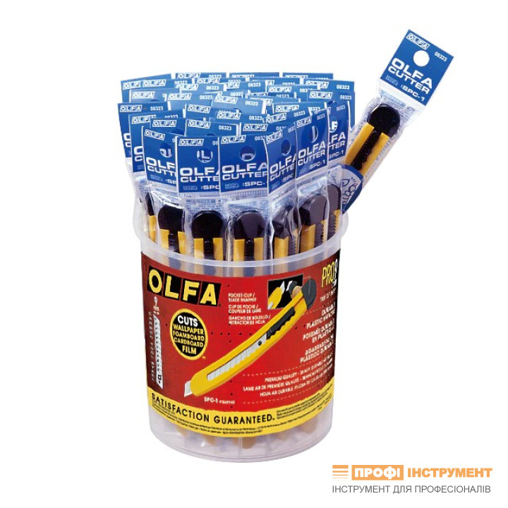 Нож OLFA SPC-1/40 универсален; копус из ABS пластика; ползуночный механизм с автоблокировкой; упаковано в прозрачное ведерко по 40 шт.